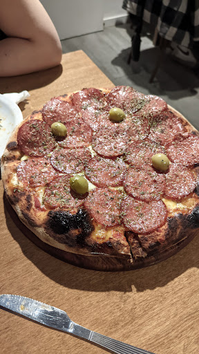 Read moreEl local por dentro es pequeño, y aunque tengan un aire acondicionado industrial programado a 19 grados hacia un calor terrible (detrás de la barra está el horno de barro donde cocinan las pizzas y eso genera que no puedan refrigerar el ambiente). El ambiente era bastante ruidoso y el servicio demoró un poco también, tuvimos que pedir hielo para las bebidas cuando llegó la comida. Las pizzas existías, riquísimas. Las empanadas de carne figuraban ser cortadas a cuchillo y eran de carne picada con coloración tirando a rojiza, probablemente por falta de cocción, en lo personal preferí no...