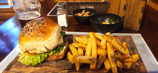 despues pedi una hamburguesa de Trucha, que venia con queso, palta tomate, lechuga y no recuerdo bien que mas... (recomendada), tiene un tamaño del estilo gourmet, y es la medida justa para comer con la mano, (claramente no es bodegón ) un pan de semillas riquisimo que lo acompañaba y unas papas que, hablando en serio, no se como la condimentaron pero son las mas ricas que comi en mi vida. (adjunto imagenes)