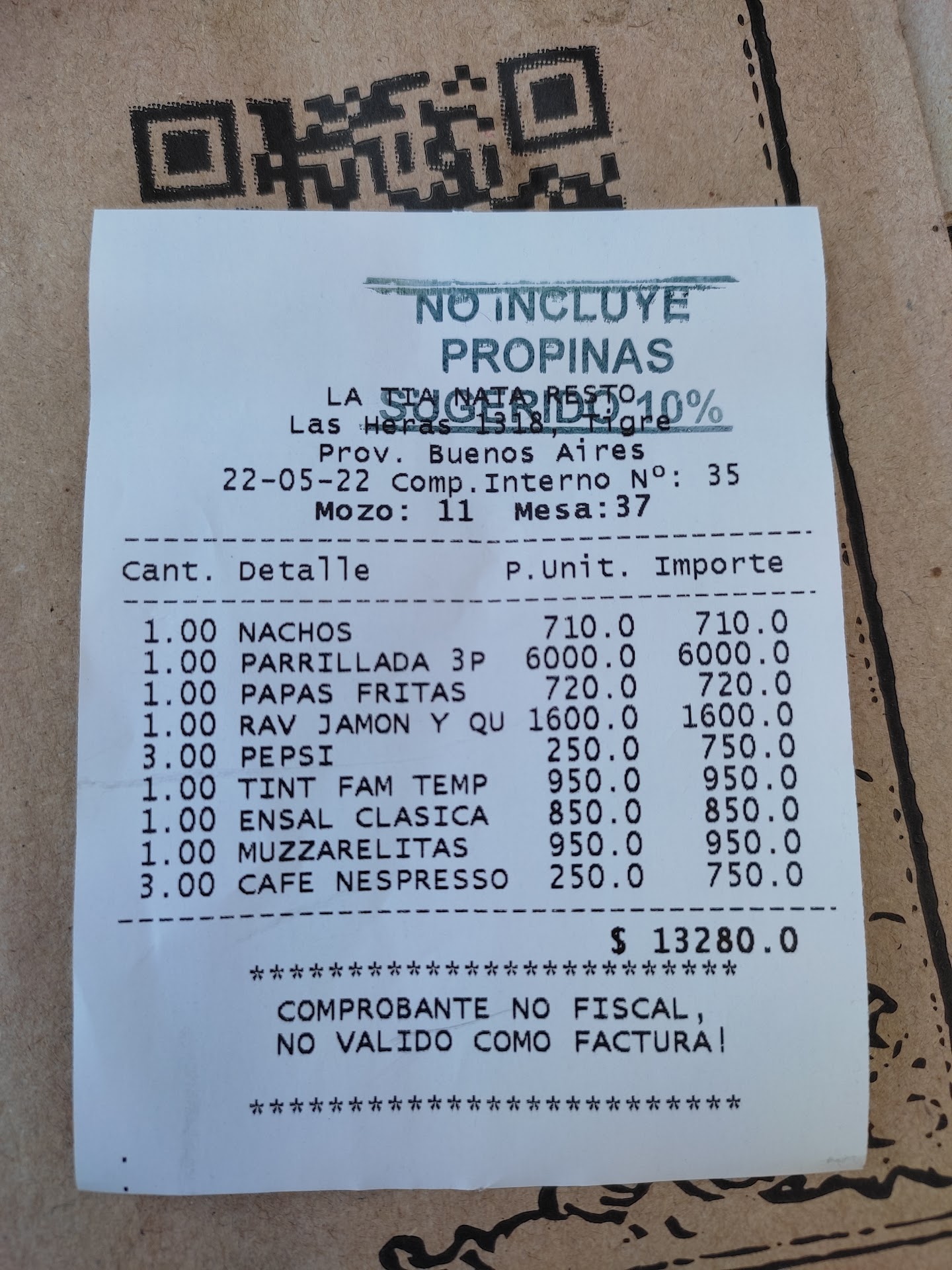 La atención a la mesa está bien. Podrían tener cartas impresas, además de los QR ya que no todos adhieren a la carta por QR, sobre todo adultos mayores, que prefieren la vieja usanza.