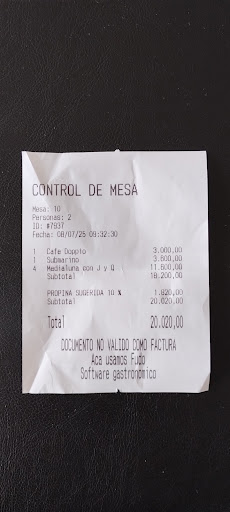 Read moreEl "mozo" que nos atendió, no nos acercó la carta a la mesa cuando llegamos al local. Tampoco se acercó a tomar el pedido, tuve que arrimarme a la caja a solicitarle lo que íbamos a comer, lo que no representa un problema en sí, excepto cuando al resto de los clientes se los atendió de otra manera. Al parecer el negocio tiene comensales de primera y también de segunda, según como te quieran categorizar. Posteriormente, nos mantuvo el pedido en espera, sirvió en primer lugar a tres mesas que llegaron después que nosotros. Y cuando se dignó a traernos lo que habíamos solicitado, tanto el café Doppio como las medialunas con jamón y queso estaban de tibios a fríos. No solo eso, sino que a lo último, la cereza del postre fue que nos introdujo la propina "SUGERIDA", al valor total de la cuenta (adjunto foto). De la cual no era meritorio en este caso. Una pena, la panadería tiene buenas facturas (excepto cuando las compras en Pedidos Ya, que te envían las de la semana pasada). No suelo escribir referencias, pero esta vez es necesario. Si pudiera no dejar ni siquiera una estrella, lo haría....