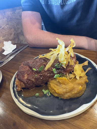 Our server was so nice , a young girl. She gave us a great suggestion for a local Pinot noir. We sat outside while work was finished inside which was not a problem. I ordered the vegetarian caramelised onion pizza and my boyfriend the ribs. That is where this place left us so disappointed . My pizza was thick which is normal in South America however it was drowning in white tasteless cheese and raw white onion, if it’s not caramelised don’t say it will be. The ribs tasted like they came from a freezer, small amount of meat and drowned in a bland sauce. We do not usually leave reviews but are leaving this one as the place , the service and the wine was 9/10 but the food is not good but so easily could be good. Go here for a drink but that’s all...