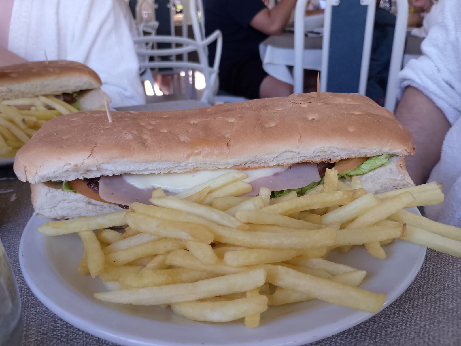 Éramos dos adultos y un niño. Pedimos una milanesa de pollo (para nuestro hijo), una porción de papas fritas (que pir lo cierto era como para cuatro personas), una tortilla de papa y una ensalada César. Todo era muy abundante, lo cual está bien, pero nos hubiera gustado saberlo antes. Ese tipo de detalles se deberían informar con buena onda, sobre todo si uno no es habitual del lugar.