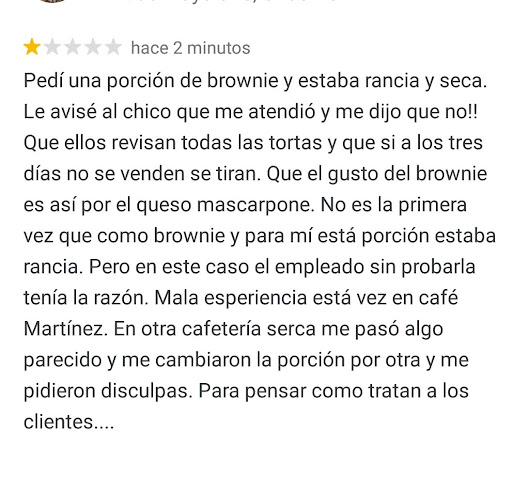 Read moreMalisima atencion ,tardaron mas de 30 minutos en venir a tomarnos el pedido y 1 hora reloj para traerlo y encima incompleto trajeron la mitad del pedido y la otra mitad a los 10 min, el exprimido caliente y el lemon pie super rancio y seco , cuando nos levantamos y fuimos hasta el mostrador a decir los inconvenientes (xq el mozo lo llamamos y no venia )nos atendieron muy mal una chica muy desagradable levantando el tono y tirando las cosas enojada nos dio otro lemom pie diciendo q el q nos habia servido era una porcion q le habia quedado 'del otro dia'(vieja) , pedimos hielo para el exprimido y lo trejeron despues q terminamos de tomar el exprimido se nos rieron en la cara , pesima experiencia no vuelvo a...
