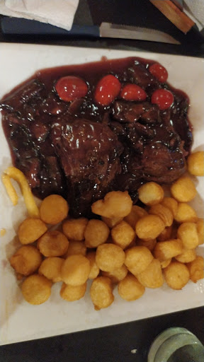 La comida no rica, si pedís algo simple difícil que se equivoquen pero si pedís algo más elaborado (no se para que lo ofrecen) ya es feo. Pedí lomo del bosque, parecía que tenía vino uvita sin terminar de cocinar y mermelada del súper. La mesas de al lado que pedían pastas, el tuco parecía cebolla con puré tomate lavado.