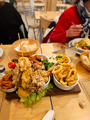 Finde largo de octubre. Sábado a la noche. 22 h. Registrarse y esperar aprox 40 minutos para que nos den la mesa para 2 personas. Ok. La muy simpática y servicial mesera, Marti, nos avisa que no hay salmón, ni hamburguesa vegetariana. Pedimos un vino rosado, El Peral, una paella y unos sorrentinos de verdura con salsa fileto. Nos traen una mayonesa y pan para esperar. La paella era arroz amarillo seco, con cúrcuma porque a azafrán no sabía....no tenía caldo de pescado, y poco bicho de mar...unos berberechos, tres camarones y tres mejillones pequeños con valva, no tenía: pulpitos, ni langostinos, ni pescado, ni vieiras...una tristeza de $ 6000, y los sorrentinos de masa gruesa, no del todo cocida...masacote por 5 mil y pico. Cuando le pedimos la cuenta a la mesera, nos pregunta si todo bien, le expresamos nuestro descontento, cosa que también hizo la mesa vecina, y no sabemos si a modo de resarcimiento, nos invita una degustación de postres: tres vasitos con tiramisú, lemon pie y cheesecake con frutos rojos, muy feo todo, una cucharadita de cada, y nos fuimos. Dicen que habían cambiado el cocinero. 13.990 $ desperdiciados, el vino zafó y la mesera pobre, ofrecía lo que...