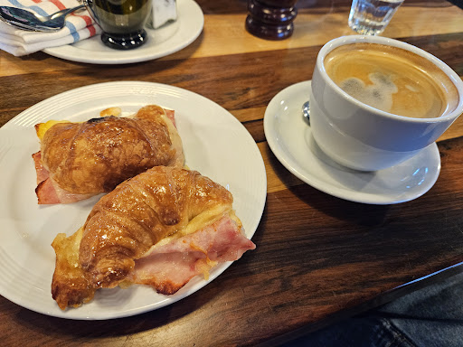 Fui atendida con amabilidad cuando estaba mirando la carta que estaba afuera del lugar por Pablo (gerentete del local), si bien no entré en el momento para ver otras opciones de merienda, volví por la propuesta de la opción de cafe con leche y medialuna con jamón y queso. Me ubique en la planta alta ya que había preguntado por si había enchufes y me asesoraron excelente; allí fui atendida por Agustín y Facundo, dos personas muy amables y a disposición absoluta. En cuanto a la comida el café estuvo muy rico hecho por la barista Candela, la medialuna si bien era de un tamaño no muy grande estaba riquísima igualmente (los productos se nota que son frescos); lo previamente dicho vino acompañado de un vasito de soda que también estaba muy rica (aclaro que soy muy crítica con las sodas que te dan en las cafeterías) y de una rodaja de lo que parecía un pan con semillas que también muy rico y para sacarte el dulce además de la soda esta bastante bien. La verdad que es un lugar para volver debido a que si bien parece un lugar para personas con mucho prestigio, también tienen precios accesibles si querés tomar un café acompañado de una medialuna. Agrego que tienen take away por si se...