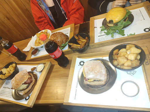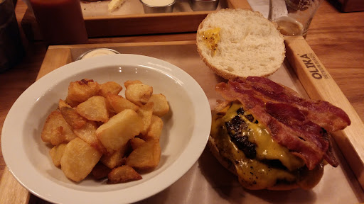 Hace rato que queria venir a degustar estas hamburguesas. El día acompañó y lleve a mi familia. El local está ubicado en una zona gastronómica con competidores fuertes y tiene con que dar batalla. El lugar es chiquito, ordenado y limpio; cuenta con mesas afuera, lo cual amplía la capacidad un poco más (pero no mucho). El sistema es de pedido en caja o, con el mozo que está con la tablet para tomarte el pedido, y luego pagas en caja con tu número. Te piden que tengas tu pedido para recién sentarte, pero si te sentas antes la gente no te dice nada. Llegamos a las 14:20 aproximadamente y estaba lleno, a las 14:45 teníamos nuestro pedido en la mesa (que lo trae el mozo). O sea, el lugar llenísimo y vino todo muy rápido. Mi mujer pidio una clásica y yo la que lleva el nombre del lugar, la doble olika. Y para acompañar, a sugerencia de unos padres primerizos de una hermosura de beba, pedi unas papas bravas, y luego pedi una hamburguesa italia con huevo. Tienen muchas variedades de panes, y cuando te toman el pedido te dicen que es lo que queda y lo que no. Yo pedi la olika con pan multicereal y acompaño super bien la crocancia del bacon. La hamburguesa es fina, esta bien de tamaño y lo que me sorprendió fue que más alla de que cocinan la carne a punto (esto esta aclarado en el menú y si te gusta de otra manera lo pedis como te gusta), la carne estaba jugosa; apretaba y salia esa grasita que taaaanto nos gusta. El cheddar estaba sabroso y bien en cuanto a cantidad, y tenía una salsa que humedecia el pan y aportaba mucho sabor. El Bacon bien logrado. La hamburguesa clásica estaba bien lograda y con buen sabor. Las papas bravas estaban riquísimas, la porción si la pedis para compartir es chiquita, pero para comer en combo con tu hamburguesa está bien. La hamburguesa Italia me pareció de buen gusto pero un tanto seca, quizás los tomates confitados aportarían más humedad si los hubieran colocado en el pan, en vez de colocarlos entre cosas que no absorven liquidos como la lechuga y el provolone (y el huevo, en mi caso). Igual se soluciona agregando una mayonesa y listo. Los precios del lugar son los típicos de casas de hamburguesas que son del tipo gourmet, pero quizás al no tener ni un mínimo de acompañamiento de papas con la hamburguesa, pueda parecer caro. Pagamos por todo (mas una pinta y un agua saborizada) $1310. Pero digo "pueda" porque se nota la calidad de los productos que utilizan y, también hay que valorar toda la puesta en cuanto a ambientación, personal y tecnología aplicada a la atención. La atencion del personal es buena. El ambiente es super familiar y por esa misma razón, faltarían cambiadores en los baños. Me gustó, lo...