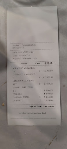 Read moreMuy buena experiencia. Bife de chorizo jugoso como lo pedí, bastante bien de ternura. Papas fritas cortadas a mano. Pastas caseras de buen relleno. Tricornis de ricota, jamón y nuez con buena calidad de la primera y trocitos discretos de las últimas. Sorrentinos bien rellenos. Precio justo a económico. La atención aunque algo lenta es simpática. Calculo que no es lenta sino uno es el acelerado que viene de movimientos diarios frenéticos. Baños simples, limpieza aceptable, funcionan bien más allá del hilo a modo de manija para activar el depósito del baño de hombres. Definitivamente volveré cuando esté...