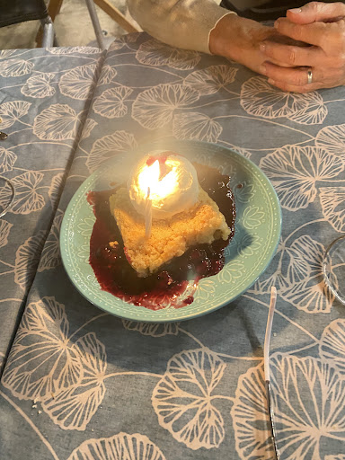 🍨 Con el postre de cortesía también trajeron una velita, estaba riquísimo (el helado puede mejorar, pero la salsa y el crumble compensaba completamente).