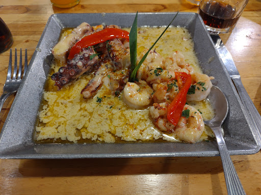 Mí plato pulpo a la plancha con camarones y salsa con Roquefort. Muy rico, muy fresco, 10 puntos.