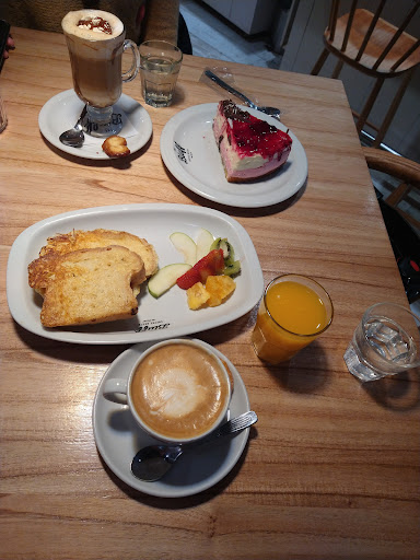 Read moreEl lugar está bien ubicado sobre Rivadavia una de las calles principales. Adentro la decoración es muy confortable y amena (con madera y murales naturales). Pedimos (octubre 2023) Latte de dulce de leche: el dulce de leche era salsa de dulce de leche y con excesiva crema que enfriaba al resto del café Porción de torta de cheese cake de frutos rojos: si bien era abundante el tamaño los sabores saben artificiales. Es salsa se frutos rojos y no frutos naturales. Café con leche: un poco fuerte casi a quemado Tostadas francesas con frutas naturales: las tostadas estabas bien, esponjosas y dulces pero poca cantidad de fruta. Gastamos $7600 Nos pareció caro por lo que fue la experiencia. El personal no sabía con exactitud lo que contenía cada latte y cuando le consultamos sobre cómo venían algunos lattes nos respondió "con todo lo...