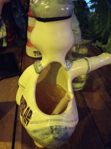 Cómo es un bar tiki poner mucho hincapié en la decoración especialmente en los vasos llamados tiki Mug, son muy lindos tienen lobos marinos tienen una forma del pato de punta mogotes tiene los clásicos que parecen cabezas de la isla de Pascua.