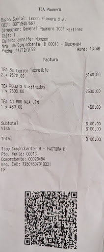 Read moreBuena atención. Variedad de platos y sobre todo la variedad de gustos de té e infusiones en hebras. Buenos precios y buenas promociones. Buen trato y lo que más nos gustó fue la flexibilidad, puesto que con mi amiga fuimos a merendar a las 20.30 horas y pudimos pedir carta de merienda igual. En algunos lugares simplemente te dicen "no, ya no se puede, es hora de cenar". La presentación de los platos y las infusiones muy originales. Vienen con teteras individuales y un reloj de arena para saber en cuánto tiempo podés tomarlo. El único detalle que no nos gustó mucho es que hay una parte que, si bien está calefaccionada, falta la mitad del techo (desprolijo, pareciera que están en plena reparación), y la mezcla de frío - calor no está buena. Sí hay otra parte que es totalmente cerrada. **Edición: Ya que Google no me deja realizar una nueva reseña, agrego en éste espacio que en plena cuarentena me comuniqué por teléfono por un pedido y fui atendida por Luciana quien fue realmente encantadora, cordial y atenta para con mi trato. Merecía tener...