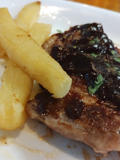 Pedí cerdo a la barbacoa acompañado de papas. El plato en general estaba muy sabroso; sin embargo, las papas no estaban completamente cocidas y, en lo personal, las prefiero más crocantes. En cuanto al cerdo, la salsa barbacoa tenía buen sabor, aunque daba la impresión de ser una versión comercial en lugar de una preparación casera.