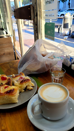 Café con leche con 3 facturas de panadería, 4 chipacitos, vaso con agua fría después del café sin tener que pedirlo, sentado en mesas de madera... Todo muy rico!! ... Hasta tienen sandwich de miga, porciones de torta, etc ... Aire acondicionado en día caluroso de verano, música suave, ambiente tranquilo, justo enfrente de la municipalidad de morón (Havanna cerca tardó "mucho" en atenderme, y venir acá fue un alivio). Tienen promoción de docena de facturas después de las 18 HS (cierran...
