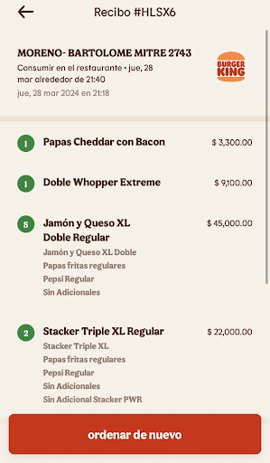 Read morePagué $1150 por una hamburguesa Whopper (incluye pepino, tomate, lechuga, cebolla, etc., ya la había pedido antes; pero viene con muchísimo aderezo y es un desastre). Por lo que, en una segunda ocasión volví a pedir la misma y le pedí, por favor, que fuera sin tanto aderezo. Me dijo que únicamente podían enviarla sin aderezos y que después se los ponía yo, por lo que acepté y le agradecí a la chica. Después, cuando me entregaron la hamburguesa eran DOS PANES Y UN PATY, nada más. Le sacaron todo. Me fijé en el total y no daba error; pero tampoco tenía tiempo de reclamar ya que tenía 45 minutos para comer y la mitad del tiempo se lo demoraron en preparar esa HAMBURGUESA SIMPLE que no pedí y con la que me tuve que conformar porque no tenía tiempo.