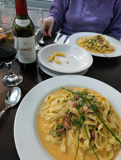 Read moreLa moza impecable, el lugar lo mismo. Poca variedad de vinos. Pedí unos fideos negros con calamares, mejillones etc. Los calamares trozados, cortados en pedazos muy chicos diría que destrozados. Quizás tenían pocos y cortarlos los hacia parecer más ( no estaban ricos) Los mejillones eran muchísimos. El otro plato ñoquis rellenos de jamón crudo, medio pelo, no tan caliente como se sirve una pasta y tenía un cuadrado muy chiquito de jamón. Fuimos xq nos habían recomendado, no estuvo bueno y...