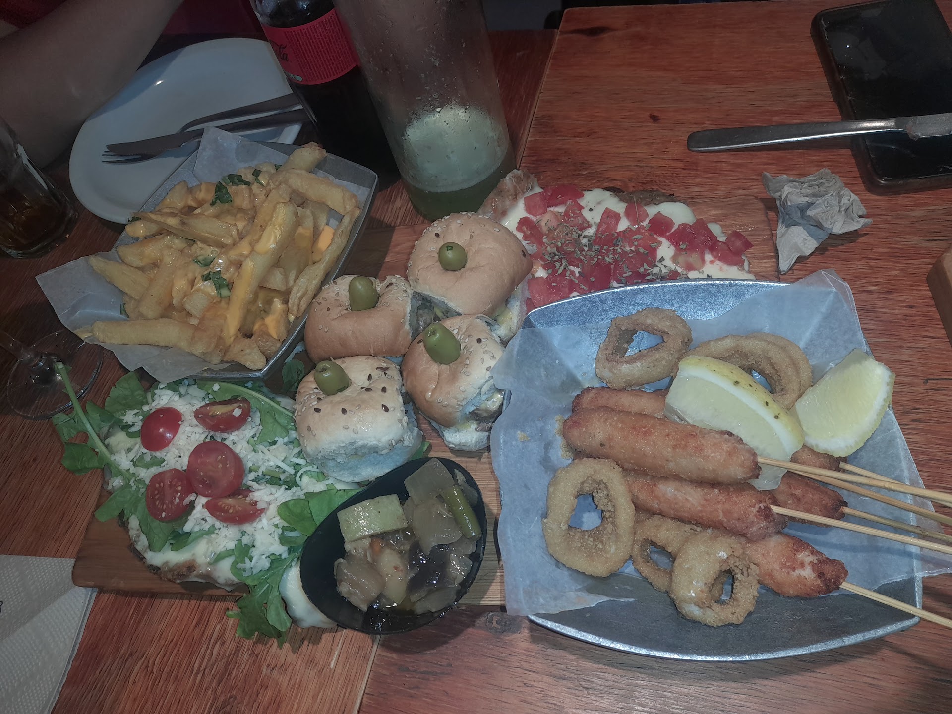 Pedimos un lomo de la casa, un lomo veggie y un pastel de carne (menu ejecutivo). El lomo de la casa lo pedimos sin lechuga y tomate (lo trajeron con lechuga y tomate). El lomo veggie tenia un pan excelente, pero los pimientos estaban apenas cocinados, casi crudos. El pastel de carne estaba muy rico.