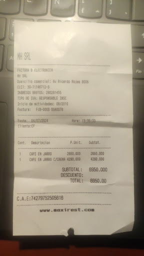 Read moreQuiero separar de la queja a quienes nos atendieron porque el servicio estuvo bien. Quiero dirigir mi critica al dueño/a en relación a la calidad de los alimentos. Nos dieron un queso untable con costra que se notaba estuvo guardado en heladera probablemente porque sobró de otra mesa y se reutilizo. El yogur que nos sirvieron estaba fermentado al igual que el jugo de naranja. Nos dieron un muffin contaminado con palta. Los untables llenos de manteca por debajo. No es grave pero me hace dudar mucho de la calidad de higiene que tienen. Es una lástima porque se supone que es una buena marca y cobran como tal cuando la calidad de los productos han sido pésimos y encima sucios. Ojalá puedan mejorar. Sus productos propios como el café un 10 ! Pero lo demás deja...