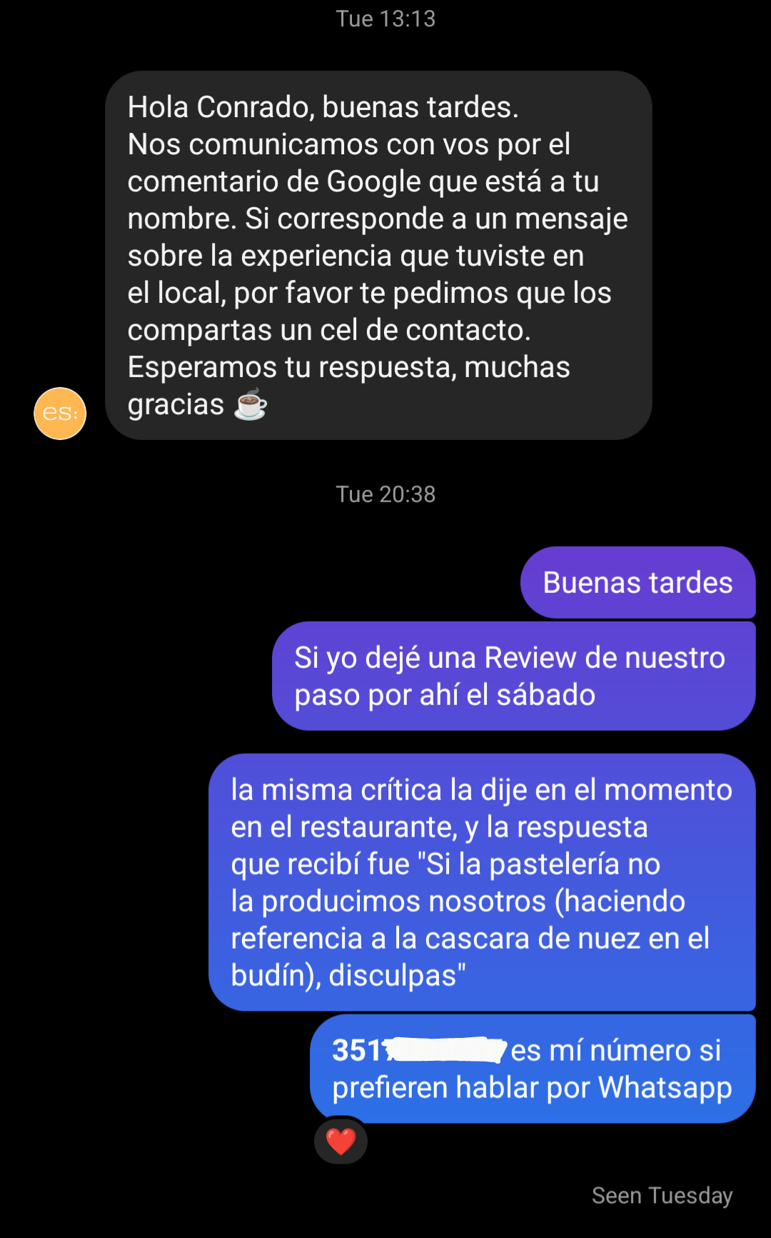 Punto a destacar manejan bien las redes. Se tomaron el trabajo de responder las reviews y contactarse para saber sobre la experiencia e intentar mejorar. (Con gusto les daremos otra oportunidad más adelante)