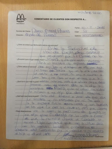 Tuve un grave problema y lo deje asentado... En ese papelito que me dieron porque segun la supervisora Mc Donald no usa libro de queja a pesar de que esta regulado y es obligatorio por la normativa vigente. Cuando estaba poniendome en la caja para realizar un pedido, melisa, una de las empleadas que esta caminando entre los clientes para anticipar la orden, pasa por mi lado izquierdo y me toca el telefono que lo tenia en la mano con mi brazo izquierdo que lo tenia apoyado contra el cuerpo, haciendo que el teléfono se le cayera de la mano, el golpe que no fu tal, fue un toque simplemente, hizo como pasa muy a menudo, que se le cayera de la mano el teléfono. Me doy vuelta porque siento el toque en el brazo y escuche el equipo caerse y la veo recogiendo el teléfono que se habia desarmado, me lamento por lo sucedido a pesar de que no fue mi culpa, y me dice que no me preocupe que no fue mi culpa. La dejo a mi señora con mi nena de 3 años esperando para hacer el pedido y me voy a comprar otra cisa para mi, a los 5 minutos me llama mo mujer diciéndome que le estaban diciendo que teniamos que pagar el telefono, que le decian que yo tenia que ir. Así que voy y me encuentro a la empleada, Melisa, muy conmocionada con los ojos llorosos, y la supervisora Noelia, que me indica que el teléfono se rompio en la caida y me dice que tengo que hacerme cargo, a lo que le digo que fue un accidente que ni siquiera yo provoque, que veamos las cámaras para que veamos que paso, que tampoco fue culpa de la empleada, que lamentablemente fue un accidente como pasa a menudo y me rozo con el teléfono el brazo y se le resbalo. Ella me dice que fue mi culpa y que debo pagarlo a lo que le digo ya muy molesto que esta hablando locuras, primero fue un accidente y ni siquiera había sido provocado por mi, y que ni se le ocurriera achacarselo a la empleada que estaba visiblemente acongojada porque no fue tampoco irresponsabilidad de ella, y que me parecia una falta total de respeto y una locura lo que estaba haciendo. Dado el hecho de que la gente nos miraba, la supervisora parece que entro en razon mágicamente y me dice que bueno, que listo, a lo que le indico que obviamente no era asi, que requeria el libro de quejas para asentar la queja por lo que me habia querido culpar y por retener a mi mujer y mi niña de 3 años hasta que yo viniera, ya con la bandeja en la mano. Y me dijo QUE MC DONALD NO UTILIZABA LIBRO DE QUEJAS, le digo que es una normativa legal y obligatoria, que no puede ser, y ella me dice de que no lo usaba, que me podia dar esa nota que puse en la foto, para expresarme. Asi lo hice, deje constancia de los sucedido. Y podria haber terminado ahi, pero no va que me siento muy cerca del mc Donald, y se ve que no me vieron, pero observo como la supervisora en la puerta del mc donald estaba aun con la nota en la mano que le había dado, hablando con la empleada melisa y con otra mas, y riendose. No puedo decir que se rieran de la situación, pero habiendo pasado recién, teniendo mi nota en la mano, moviendola como la movia, y hablando con la misma empleada del hecho recien habiendole entregado la nota, dudo que hablaran y se rieran de lo nublado que estaba el cielo. Espero que alguien de social media o responsable de esto se comunique conmigo, porque si no lo hacen, el martes voy a estar subiendolo a "la voz del interior", "canal 12", "radio lv3", y no los etiqueto porque justamente quiero darles la...
