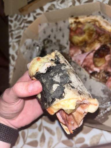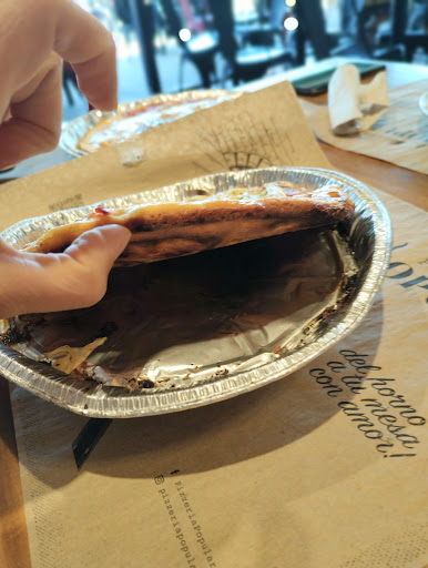 La pizza? no se si llamarla así, pedimos una fuggazza con provolone, que no tenia ni un poco de cariño, cebolla cruda, provolone quemado y la masa hecha un globo, sintesis, se noto porque la sacaron en solo 5 minutos. Luego pedimos otra de verduras y hongos, estaba bastante mejor, pero en ambos casos, no llevaban casi nada de ingredientes.