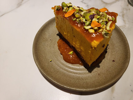 El primer postre fue el Cheesecake de Cabutia, brownie de chocolate, mermelada de zapallos y pistachos. Y este fue una excelente ejemplificación ante mi amigo, para entender cuándo un postre incluso teniendo diferentes elementos de calidad, la suma de las partes pueden no tener cohesión. Como poner a Marta Argerich a tocar algo con Axl Rose. Cada elemento era correcto, pero no había sintonía. El brownie no sorprendía por dulce cuando era comido solo, pero en el postre al combinarse con la mermelada, quedaba desbalanceado y muy dulce al paladar. Ojo, totalmente mejorable: un poco más de acidez a la mermelada, un poco menos dulce el brownie (o un poco de sal), y podría ser un postre excelente; hay potencial. Y enorme.