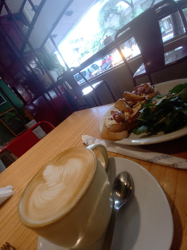 Read moreSi bien le doy cuatro estrellas, sería 3.80, esto debido a algunas cosillas, pero las considero circunstanciales y prefiero redondear hacia arriba (encontré el lugar un poco, solo un poco descuidado, y los ánimos de atención bajo, pero igualmente bien, aunq todo esto parece deberse al partido de la selección del día anterior, donde el trabajo aparentemente fue muchísimo). Vamos primero con la comida: un café leche, con una textura suave y encantadora al paladar, además del precioso trabajo del Barista; la tostada con queso azul, pera (te dan la opción de cambiar por durazno) y almendras, una deliciosa armonía de sabores, me gustó mucho! La presentación de los productos, agradable. En cuanto al lugar, es chiquito pero de una ambientación encantadora (casi exquisita diría) al igual q sus colores (en esto incluyo la vajilla también), y muy acertado el toque de las plantas (y la elección de la música ambiente).... Soy fanática de sentarme junto a la ventana, pero de donde estaba sentada (y porq no había gente en la barra, donde la mirada solo queda condicionada al exterior) podía disfrutar tanto de la vista externa como del ambiente interno que de por si es un grato espectáculo a los ojos. La atención es correcta, los precios acordes (teniendo en cuenta q la tostada es de proporción generosa). Es un bonito y agradable lugar ☺️, mis únicas recomendaciones serían: renovar las cartas, ya que se notan q llevan su tiempo, están algo mal trechas; y servir el café con leche con un...