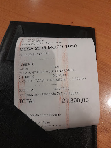 Read moreEs un lugar lindo, amplió, familiar. Con la comida tuve un experiencia rara, trajeron la panera y vino con los típicos panes de pizza, con lo que rápidamente la pizza se convirtió en una opción. Pedí una pizza individual para mi hijo y para el resto pedimos una ensalada César con trozos de pechuga, sorrentinos rellenos y ñoquis a la parisiene. La ensalada era lo más abundante, rica. La pizza estaba también rica y la porción individual era abundante. La cuestión viene con las pastas, los sorrentinos estaban bien de sabor, nada del otro mundo, pero la porción me pareció pequeña. Y los ñoquis, estaban espectacularmente blanditos (no eran un mazacote) pero no tenían sabor. Y cuando ibas a intentar buscar algo de sabor en la salsa, no sólo no lo encontrabas, sino que costaba encontrar algún pedazo de pollo, jamón o champiñón más grande que la cabeza de un fósforo. Era la primera vez en mi vida que comí una parisiene casi licuada. Y también fue la primera vez que pude terminar mi plato de ñoquis sin explotar. Justamente en la mesa que estaba detrás nuestro, una familia se quejaba que había pedido pastas (la anterior vez que habían ido) y que no llenaba la porción, y por eso, pidieron milanesas con papas fritas. Algo similar, en cuanto a la cantidad de las pastas, me sucedió en casa caraffa en la cumbre. No se si será que estoy acostumbrado a que en todos los lugares a los que voy en Buenos Aires, al pedir pastas, las porciones son siempre muy abundantes, o, realmente en ambos lugares sirven porciones muy pequeñas en platos muy grandes. Me pareció caro, fue una experiencia dividida. Ya teniendo en cuenta lo sucedido con las pastas, si regreso, no ordenaria pastas. Tiene promociones de 2x1 en tragos y en desayunos...