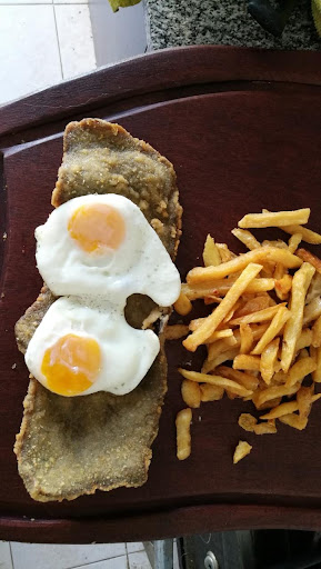 La milanesa en cuestión. No sólo el tamaño es irrisorio, los dos huevos de codorniz que le pusieron arriba. La calidad de la misma, la porción de papas. La presentación en una bandeja de plástico con todo desparramo (papas hasta por debajo de los huevos. Realmente malísimo. La otra milanesa (cheddar con champignones) no puedo decir más que "comestible". Pedí una porción de papas (viene sin) y es básicamente un puñado de papas recalentado al horno.