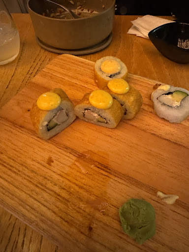 Y me trajeron 15 piezas de las q adjunto en la foto… Chiclosas, todas kanikama rebozado frito. 15 piezas así, ni una sola de salmón (supuestamente era el mejor omakase)