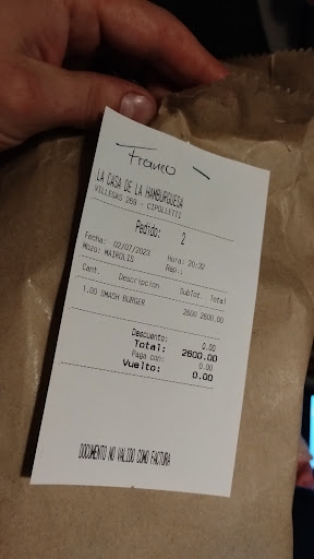 Generalmente pido la americana y es rica, aunque la hamburguesa es muy gruesa y parece medio mascote de carne. Hoy quise cambiar para probar una más finita y me pedí una "smash" era igual que las otras hamburguesas y eran dos masacotes de carne con sabor a recalentadas o carne descongelada(tipo vieja).No recomiendo la smash, si querés comer una rica en Cipolletti son mejores las de Caos o las hamburguesas de los chicos de Fragosmash son muy buenas, smash verdadero y usan productos de primera calidad. Dejo el vídeo de la supuesta Smash de la casa de la hamburguesa y el ticket...