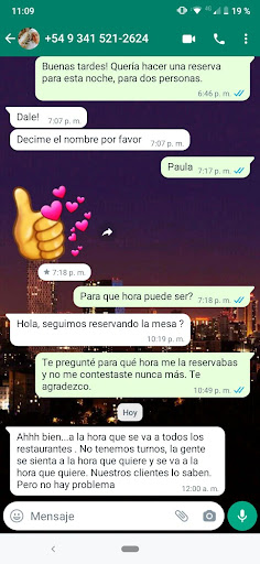 La verdad una vergüenza, mandé un mensaje para hacer una reserva, me dijeron que sí y cuando pregunté la hora, no me respondieron más hasta después de tres horas que me preguntaron si me mantenían la reserva o no, a lo cual pregunté cuál reserva si no me habían dado un horario, dos horas más tarde me dijeron que era a la hora que se va a todos los restaurantes (y cuál es la hora que se va???), Que no dan horario, que el cliente va y se sienta a la hora que quiere, entonces para qué solicitan reserva en la página??? Me hubieran dicho eso desde el inicio y hubiera ido sin reserva y sin esperar una respuesta que nunca llegó y que posteriormente me respondieron tan groseramente como si la equivocación hubiera sido mía, parece un lugar agradable, pero cuando la atención no es buena, no te dan ganas...