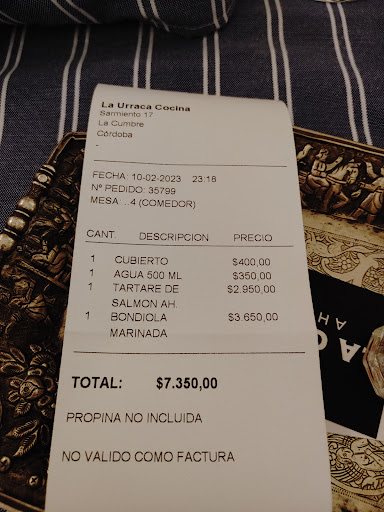 Read moreLa Urraca nace en 2019, cuando una amiga de Mery Duggan les ofrece a ella y Carlos "Donca" Santillán, una casona con gran patio en el plena zona céntrica de La Cumbre. A partír de ese momento, la calidez humana de Mery y Donca se unirían a pilares fundamentales, que un espacio gastronómico que se desee proyectar en un largo camino, no puede dejar jamás de lado: ambientación, funcionalidad, hospitalidad y la impronta en sabores que enamoren y generen emociones. @laurracacocina es la realidad de lo que cité, un espacio que va a ser funcional a tu momento (la intimidad y belleza de un petit salón, lo descontracturado de un decorado living con comodísimos sillones y la frescura de un patio, donde un gran tilo, te abraza de naturaleza), la hospitalidad de un equipo que desde que llegás, se esmeran a estar en cada detalle para que te sientas como en tu casa y en relación a los sabores: aunque Mery y Donca resuman su propuesta como "Cocina Casera", hay un vuelo gastronómico que, asevero, eleva encasillarlo en ese término (y logra emocionar). Lugar para disfrutar de momentos que los creas vos y que vas a estar cuidado en el más mínimo detalle por un enorme equipo y dos anfitriones que son un lujo!. A tener muy presente: siempre consultar las redes del lugar en cuanto a los horarios y cómo reservar (algo fundamental), como así también, información que Mery y Donca van compartiendo para que todos, puedan disfrutar plenamente de una hermosa cocina como lo es La Urraca!. Gracias a Paola y Paula por estar en cada detalle y gracias enormes por el mimo de Mery y Donca para cerrar mi almuerzo!. Obvio: regreso por más!.♥️ Lo elegido📸 • • ✅️Appetizer: Paté de hongos, manteca con granos de sal y panes.