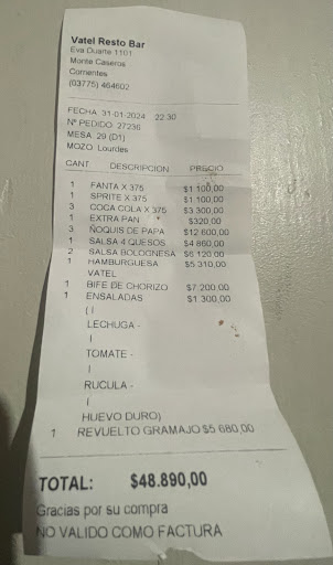 Read morePÉSIMO!!! SI SOS TURISTA TE MATAAAAAN !!!! Precios de Punta del Este y comida del Bajo Flores!!!! Incomibleeeee !!!! Y Carisimoooo !!!! $48.890.- !!! Un plato de Ñoquis $8860.-!!!! Te cobran la salsa de los Ñoquis aparte !!! Están Locos!!!