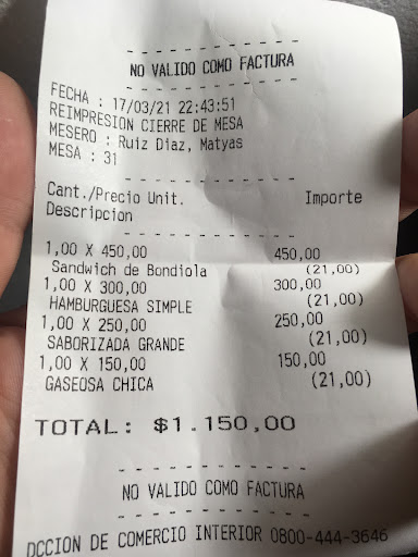 Read moreEntre la comida (asado) y bebidas me cobraron $29.500. Poco aceptable lo más decepcionante es que cuando querés pagar con QR de Mercado Pago no tienen habilitado el mismo te piden que le hagas transferencia (sin costo alguno)... UD que piensan si ellos no te perdonan nada: la bebida $4.400; una tira de vacio de 10 cm ($7.200) y un chorizo ($1.500) y la porción de papas...