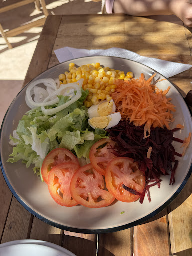 Read morePedimos una ensalada completa y una milanesa con papines. Ambos eran abundantes y de sabor estaban bien. Lo único, como se ve en la foto, que la ensalada deberia venir en forma de “ensalada” y no todos los ingredientes separados para que uno tenga que cortar, mezclar, etc. (además debería venir en plato hondo). Era un domingo el mediodía y temprano (13 hs aprox) y ya se habían quedado sin limonada y empanadas de llama, una lástima. La atención fue rápida dentro de todo, sin nada para destacar. Eso sí, un punto importante que mencionan muchos comentarios y encima el dueño parece que no se digna a disculparse, todo lo contrario. Te cobran un 10% más con tarjeta de crédito, cuando es ilegal hacerlo. Los cargos o demoras extras que puedan tener por este medio de pago no debería trasladarse al cliente. Es común que se haga esto en Purmamarca (y en toda la región en general), pero también hay lugares que no hacen diferencias. Les recomiendo que busquen y pregunten antes de elegir. Había una banda de folklore muy buena, que...