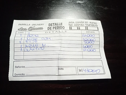 Excelente atención de Giuliana que constantemente estaba atenta por si necesitábamos algo. Lo mismo sucedió con Martín, el asador. Muy lindo ambiente familiar y la comida 10 puntos. Comimos entrada de salpicón de ave y lengua a la vinagreta, parrillada (matambrito, vacío, chorizo, mollejas y chinchulines) y bombón escocés. Dato menor pero que quiero destacar: la pulcritud del aceitero y vinagrero (ver foto). Otra vez que pasemos por Rufino, sin...