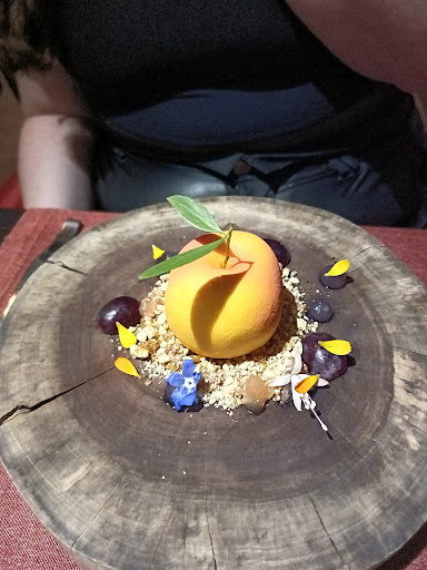 PLATO 8: Dúo de Postres - Deconstrucción de Lemon Pie y Durazno con Chocolate Blanco con corazon de Campari: La deconstrucción de la tarta de limón fue una reinterpretación lúdica de un clásico, con cada elemento elaborado meticulosamente para mostrar la variedad de sabores que se encuentran en una tarta de limón tradicional. La cuajada de limón en forma de un limon, de corteza mantecosas y el merengue sedoso creando una deliciosa sinfonía de agridulce. El segundo postre, un durazno de chocolate blanco con corazón de Campari, fue una creación caprichosa que deleitó tanto a la vista como al paladar. La suave cubierta de chocolate blanco recubría una explosión de mousse con infusión de Campari, proporcionando un contraste sorprendente y refrescante.