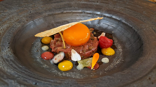 Plato 2: Tartar de Ciervo con Yema de Huevo Curada y Puré de Verduras: El segundo plato elevó nuestra experiencia gastronómica a nuevas alturas. El tierno tartar de ciervo, perfectamente condimentado y complementado con la riqueza de la yema de huevo curada, mostró la maestría del chef en el equilibrio de sabores. El puré de verduras que lo acompaña añadió un toque terroso, realzando la profundidad y complejidad general del plato.