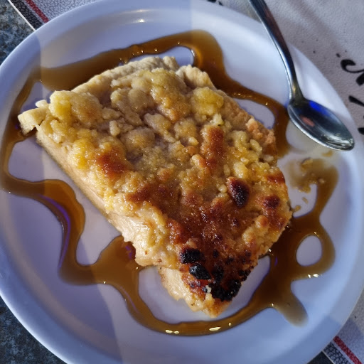 Paseando por la peatonal encontramos varios locales gastronómicos similares y decidimos merendar acá. El estilo del mobiliario es tipo cervecería con hierro y madera, ambientación con plantas, música y luces llamativas. Al parecer se hace local bailable, tocan bandas o algo así porque en la parte de adentro hay un pequeño escenario además de barra y más mesas. Nos gustó que en la parte exterior con varias mesas bien separadas tiene el atril de menú y en un vistazo podés decidir si es de tu conveniencia tanto en cuanto a gusto como bolsillo. Hay varios combos como infusión con porción de torta, con tostadas, con alfajor, etc y además de cafetería es bar y ofrece comida para almuerzo o cena y opciones de tapeo. La atención del camarero fue muy buena. Nos limpió la mesa y pudimos estar ahí con nuestra mascota sin problema. Todas las mesas tienen alcohol en gel. El pedido llegó bastante rápido. Rico café y leche que llegó caliente con la tostada grande de pan tipo de campo muy muy rico con huevos revueltos y unas crostitas de panceta que le daban el toque. Es clave para la experiencia que llegue bien caliente a la mesa (difícil de lograr y muy reconfortante que se agradece especialmente con el frío que está haciendo). La torta de manzana es muy rica también. No es un crumble, es similar a una torta casera que está muy bien igual (la salsa de caramelo tal vez sobra pero es muy personal). Había poca gente cuando...