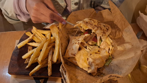 Read moreLa comida muy sabrosa. El pollo del wrap estaba super jugoso y fresco, riquisimo. Las papas fritas son tipo rústicas, muy buenas. La moza muy amable. En cuanto al ambiente, luz bajita, música. Pongo una estrella menos porque por ser un cervecería esperábamos que tuvieran más variedad de cervezas, incluso cerveza tirada. En la carta figuran dos marcas de cerveza artesanal pero solo tenían una, y no todos los tipos de cerveza solo ipa, gol golden y stout de botella. Te cobran un 10% menos en efvo, SOLAMENTE.