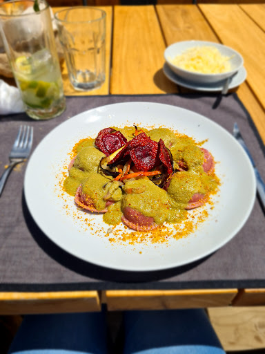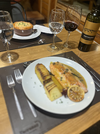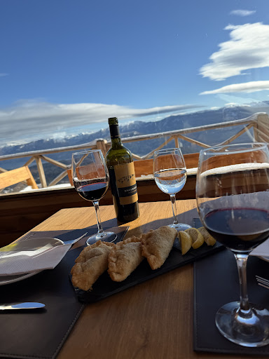 Fuimos anoche a comer. Tengo varios puntos a comentar sobre mi experiencia: El lugar es muy lindo pero le falta calidez. No solo respecto a la Ambientacion, sino también respecto a la temperatura. Hacia frío. El mobiliario es divino, pero las sillas de las mesas de dos, son demasiado bajitas. Incómodo para comer. La mesa se tambaleaba. La panera tenía pan casero, pero se sentía como si fuesen las rodajas que se cortaron para el Desayuno y sobraron. Con darle un golpecito de calor cambiaba todo. Yo comí el guiso de lentejas veggie, que estaba bien (NO HAY NI UNA OPCIÓN VEGANA Y MUCHO MENOS PEDIR OPCIONES SIN GLUTEN). Excesivo el precio para lo que fue. Esperaba más. La persona que estaba conmigo comió una trucha que estaba espectacular! Pedimos dos copas de vino. Vinieron servidas desde la cocina y con poca cantidad para lo que se acostumbra cuando se pide por copa. De postre pedimos volcán de chocolate. Estaba bien, cumplió. Pero de nuevo, un precio excesivo para el tamaño. Creo que son todos puntos que se pueden mejorar!! Fui de noche, imagino que el atardecer debe ser una...
