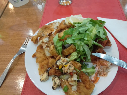 La comida es abundante y muy variada. Hay carnes de todo tipo pero la carne vacuna estaba llena de grasa, horrible. Mucho nervio! Hay parrilla y muchas frituras; entre ellas, por ejemplo, patitas de pollo caramelizadas. Las patitas estaban geniales pero, reitero, la carne estaba horrible. La comí porque sino te cobran por dejar comida en el plato. Tienen rabas, corralitos y cositas fritas que no están pasadas en aceite, están bien hechas y muy sabrosas.