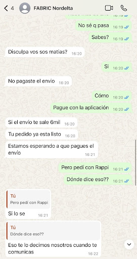 Read moreHicimos un pedido a través de Rappi hoy Domingo 13/7 a las 14.30 hs con un tiempo de envío estimado de 30 minutos. Habiendo pasado más de una hora nos comunicamos con el repartidor de Rappi que estaba en el local pero nos dice que no le entregaban el pedido. Intentamos comunicarnos con fabric por todos los medios pero fue imposible. Recién a las 16.20 nos respondieron por WhatsApp diciendo que no lo enviaban porque teníamos que pagar un envío de $6,000 a “Fabric” (cuando Fabric de lo único que se estaba ocupando era del sushi porque nada tenía que ver con el delivery) aparte del envío y el servicio que ya habíamos pagado por Rappi. Esto obviamente no está comunicado en ningún lado. Cuando le pedimos el ALIAS para hacer la transferencia nos pasan un alias personal a nombre de “JAZMÍN”. Dejo todas las capturas de pantalla. Lamentablemente llegaron a borrar el alias de la conversación antes de que pudiéramos hacerle captura. Claramente necesitan un cambio urgente de empleados, le están robando a...