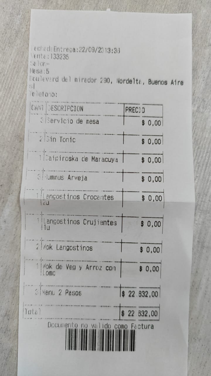 Read moreEl viernes 22 de septiembre fui a almorzar con dos amigas a la sucursal de la Bahía de Nordelta. Ordenamos tres menús ejecutivos, que incluían entrada, un plato principal y una bebida. Pedimos dos gin tonics y una caipiriña, luego de tomar el pedido nos informaron que no tenían hielo y que los tragos demorarían un poco más de lo habitual. Si bien el restaurante estaba casi vacío, tardaron más de media hora en traernos la entrada, y cuando llegó estábamos sin los tragos. Como la comida tenia una salsa picante, pedimos que aunque sea nos sirvieran agua, ya que la experiencia estaba siendo desagradable. Al traernos el plato principal, nos dijeron que no iban a poder servirnos los tragos, ya que no lograron conseguir hielo, y nos ofrecieron gaseosas. La verdad, una completa decepción. Esperábamos que al menos nos hicieran una atención por la mala experiencia, pero nada. Y por último, pero no menos importante, NO nos dieron factura, solo un ticket sin ningún...