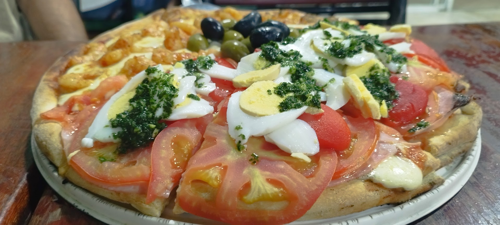 La fiaca pizzeria. En las entrañas de Lanus y con el respeto delictivo que se rumoreaba, llegamos en una fria noche al lugar. Sin mucha historia, ensamblaron de las mejores pizzas de zona sur en un garage amplio, con puertas balcón de vidriera, decoraciones de noventosos artefactos y juguetes del mas allá, uno se sienta en el lugar y se siente mas en la casa de un familiar que una propia pizzeria. Cocina a la vista que la separan del salon apenas con hogareñas barritas, aroma a cumpleañitos, y los anfitrones sonríen, juegan entre ellos, toman mate, pero siempre atentos a la atención del comensal, alegra el buen ambiente del lugar, se contagia. Pedimos una empanada de camarón para probar de entrada, sin gourmetiar, la clavaron en el angulo, 3/4 camarones enteros con salsita adentro de un tapa y a otra cosa. Exquisito. Luego fuimos por la clasica de muzza, es mas grande que las grandes normales. Media masa, buena salsa, muy buena muzzarella, aceitunas sin carozo 👌. Llego caliente, hecha en el momento y en tiempos acordes. El piso crocante y la liviandad de la masa dan una nota de excelencia. Me quede con ganas de probar la estrella del lugar con panceta y huevos fritos. Hermosa experiencia, me fui feliz, volvere x ese manjar y me llevare 1/2 docena de emp de...