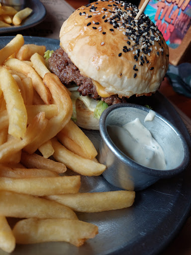 El lugar está bueno, a lo mejor la música es un poco demasiado alta y hasta tienen parlantes abajo de algunos asientos, por lo que se hace casi imposible, a veces, mantener una charla sin tener que elevar bastante la voz. La ambientación está bastante buena de todos modos y está genial para gente joven. Tanto la pinta de cerveza como la comida en general tienen un precio moderado, estándar, pero la calidad es muy buena. Las papas fritas que acompañan cualquiera de sus hamburguesas, por ejemplo, son caseras y deliciosas, no son McCain ni nada de eso. Hablando de la hamburguesa, que creo yo es la especialidad, es tremenda. Bastante grande (no pidan carne extra, con una es suficiente), sabrosa y bien cocida. Aún así, pienso que ninguna de las hamburguesas del menú está 100% correcta. A todas les falta algo o les sobra. Deberían añadir una que tenga únicamente cheddar y panceta, por ejemplo, u otra que tenga tomate, lechuga y queso, para aquellos que prefieran algo clásico; así se evitan lo de "sacale esto pero dejame aquello". La razón por las 4 estrellas es que la atención no está a la altura, o por lo menos lo sentí así. El muchacho que nos atendió parecía que no tenía ganas de estar ahí y respondía nuestras dudas (perfectamente normales) con mala cara. El resto, 10 puntos. No se suele llenar a la noche a menos que vayas pasadas las 22 horas, a no ser que haya oferta en cerveza o happy hour. Si es así, andá...