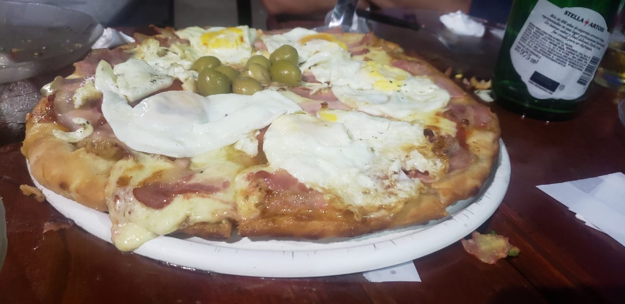 La fiaca pizzeria. En las entrañas de Lanus y con el respeto delictivo que se rumoreaba, llegamos en una fria noche al lugar. Sin mucha historia, ensamblaron de las mejores pizzas de zona sur en un garage amplio, con puertas balcón de vidriera, decoraciones de noventosos artefactos y juguetes del mas allá, uno se sienta en el lugar y se siente mas en la casa de un familiar que una propia pizzeria. Cocina a la vista que la separan del salon apenas con hogareñas barritas, aroma a cumpleañitos, y los anfitrones sonríen, juegan entre ellos, toman mate, pero siempre atentos a la atención del comensal, alegra el buen ambiente del lugar, se contagia. Pedimos una empanada de camarón para probar de entrada, sin gourmetiar, la clavaron en el angulo, 3/4 camarones enteros con salsita adentro de un tapa y a otra cosa. Exquisito. Luego fuimos por la clasica de muzza, es mas grande que las grandes normales. Media masa, buena salsa, muy buena muzzarella, aceitunas sin carozo 👌. Llego caliente, hecha en el momento y en tiempos acordes. El piso crocante y la liviandad de la masa dan una nota de excelencia. Me quede con ganas de probar la estrella del lugar con panceta y huevos fritos. Hermosa experiencia, me fui feliz, volvere x ese manjar y me llevare 1/2 docena de emp de...
