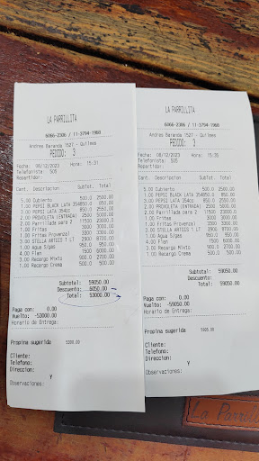 Read moreLee atentamente. Ves que hay dos tickets? El más bajo corresponde al precio que me iban a cobrar. El más alto al que me cobraron. Me dijeron: efectivo o débito, 10% de descuento. Pago con débito y me traen para formar un ticket superior. Me acerco a la caja y la cajera: muy mala onda, me dice que estoy equivocado, porque el descuento solo corresponde al pago en efectivo. La corrijo y le indico que si me cobran más barato pagando en efectivo, es equivalente a decirme que si pago con débito me hacen un recargo, lo cual es ilegal y le indique que no tengo ningún problema en denunciar el comercio ante AFIP. Se comunicó con su jefe, me pidió la tarjeta nuevamente (débito) y está vez me cobró $53.000. me la entregó y me dijo gracias, pero estás equivocado, hasta luego. Le dije: en primer lugar, me cobraste dos veces, ya que no anulaste la compra anterior y en segundo lugar no voy a discutir porque no SOS la dueña y lo tenés porque fumarte mi malestar por políticas del dueño. Anuló y me fui. Más tarde, revisando el ticket, veo que los HDP nos pusieron en el ticket el recargo de dulce y crema como adicional, es decir, $1400 adicionales a los $1500 por un flan. El problema no es el precio porque hoy son monedas, el problema es que no lo aclaren. En fin. Buena comida, te llenas, buen precio y lugar agradable. Cajera mala onda, parrilleros copados y...
